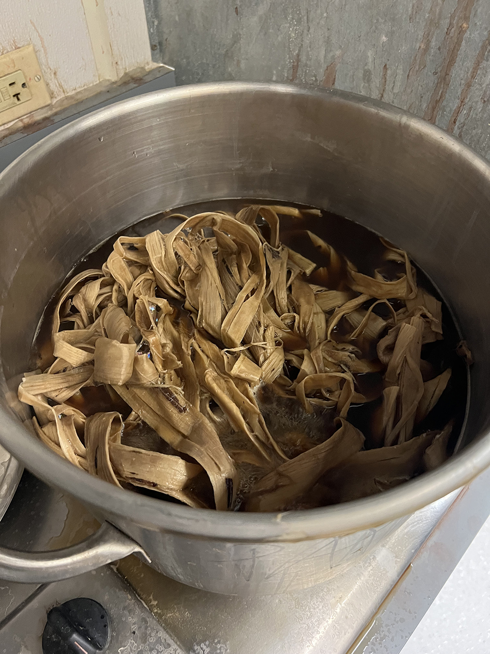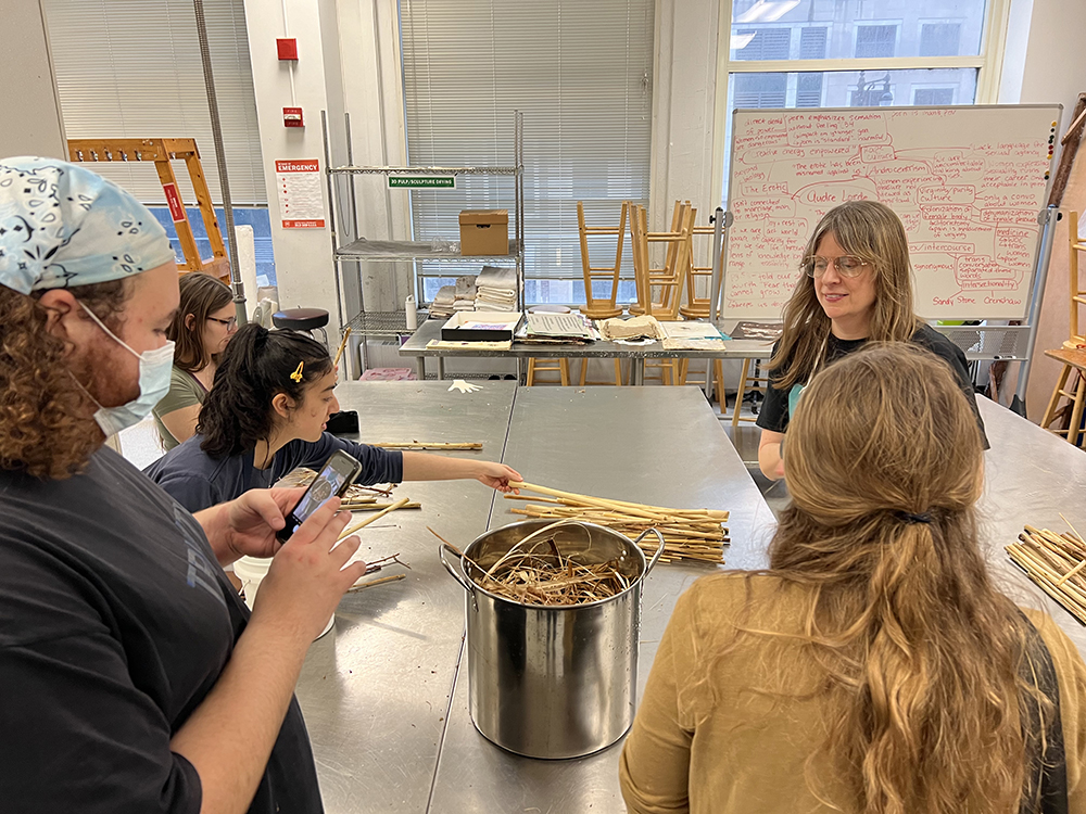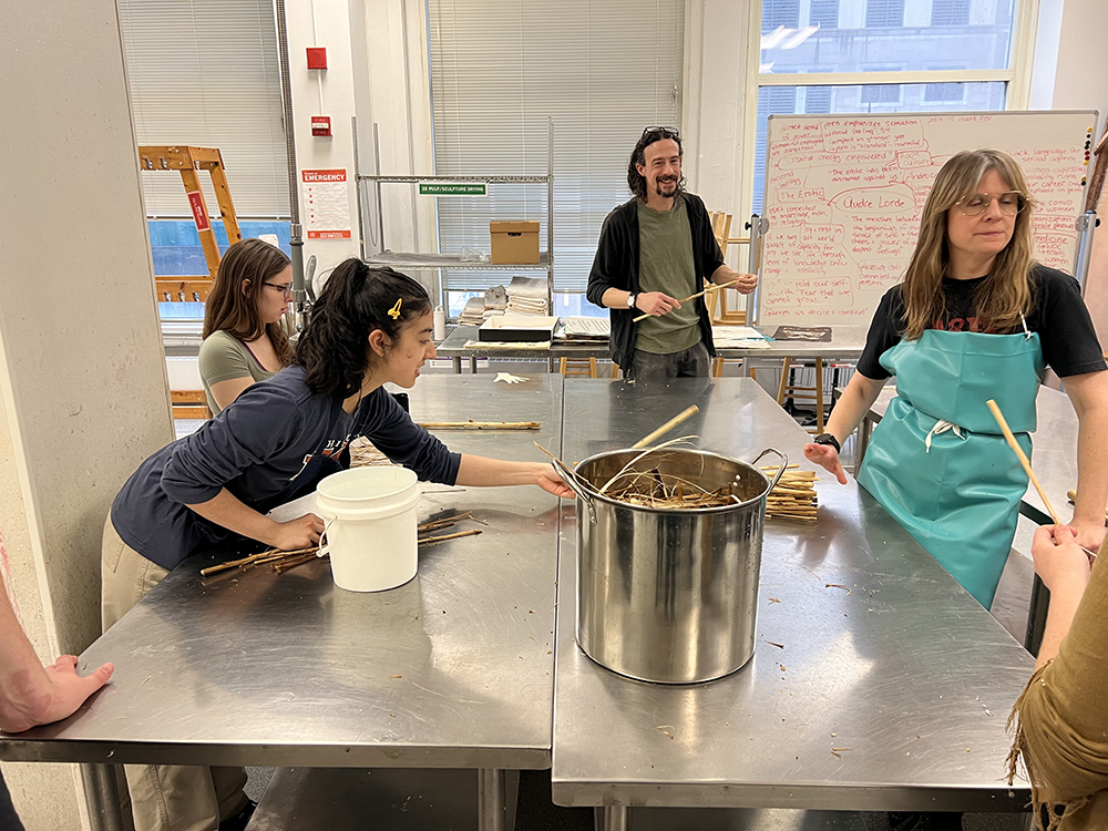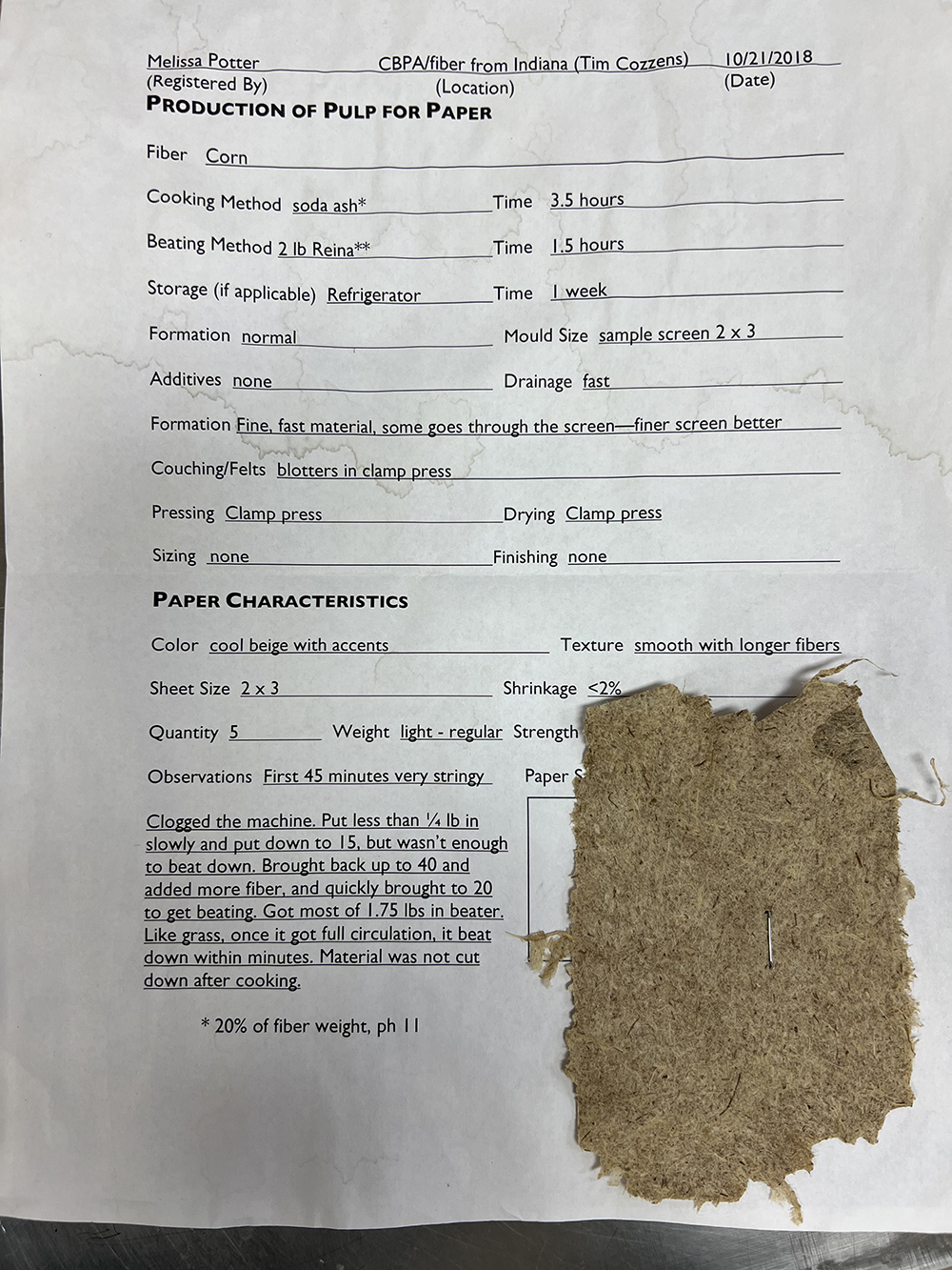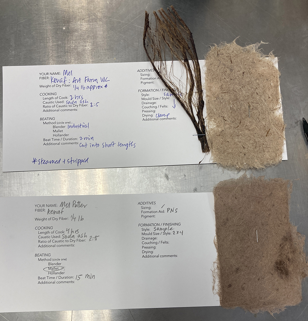 This program is a two-day workshop to research and implement materials grown in Art Garden @ UIC for hand papermaking. A focus on Experimental Farm Network-sourced kenaf will center the program on the history and utilization of pre-industrial paper for micro-industry, social engagement and climate-responsive product development. The workshop takes place in the Columbia studios but focuses on practices that can be replicated in smaller-scale and informal spaces. Mulberry fiber, also a bast fiber like kenaf, will be used as the primary material for our program as it is a realistic material to teach in a two-day format and assures outcomes for the fiber. The kenaf will be processed and studied alongside mulberry to produce a pulp log for fiber use. Factors include cooking agent (kenaf may require lye, which is not appropriate for studio use), material viability (harvested post seeding, container vs. land grown, stem branching, etc) and work timing.